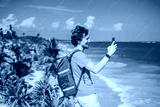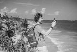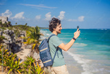 Male tourist enjoying the view Pre-Columbian Mayan walled city of Tulum, Quintana Roo, Mexico, North America, Tulum, Mexico. El Castillo - castle the Mayan city of Tulum main temple