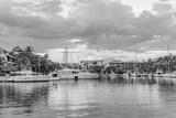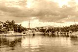 Luxury yachts docked in sea port at colorful sunset. Marine parking of modern motor boats