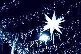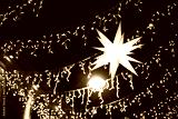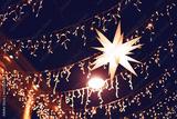 Christmas background. Decorative luminous star, bright festive street lighting with light bulbs and garlands. New Year's decor on the city streets.