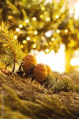 Christmas decor made from natural materials. Fir cones and branches against the background of sparkling garlands, soft selective focus
