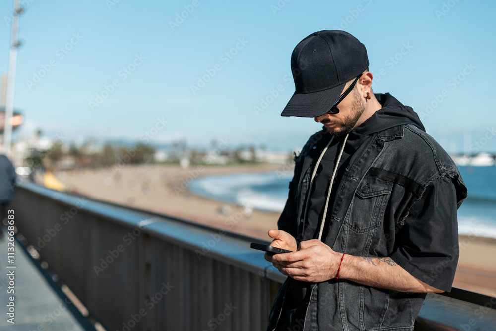 Jumping crazy programmer, web developer or designer holding laptop in his hands and pointing to your text. Discount, sale, season sales. Shocked or surprised facial expression. Funny promotion poster.