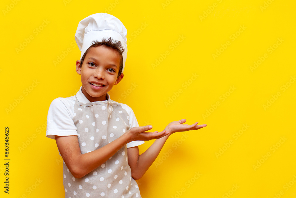little chef child african american in uniform pointing with hands at copy space on yellow isolated background