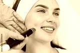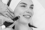 Young woman is relaxing getting vaccum facial hydro peeling procedure in beauty salon. Hardware face pores cleansing, close-up.