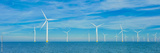 Drone view at windmill turbines, Windmill park with clouds and a blue sky, windmill park in the ocean aerial view with wind turbine Flevoland Netherlands