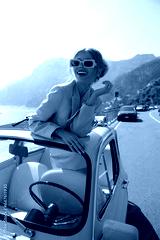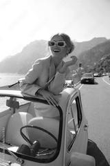 beautiful woman with blond hair in elegant fashion clothes posing near a yellow retro car on the Amalfi coast in Positano