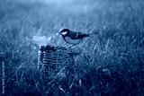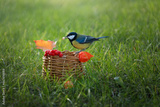 The titmouse eats seeds from the bird feeder. Feeding birds in autumn