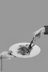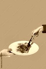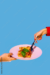 Female hand serving delicious Italian food, putting lasagna on plate over green and blue background. Bolognese sauce. Concept of Italian food, cuisine, taste, cooking, menu. Pop art. Poster, ad