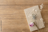 Dried roses and babies' breath flowers accompanied by a book on a wooden table