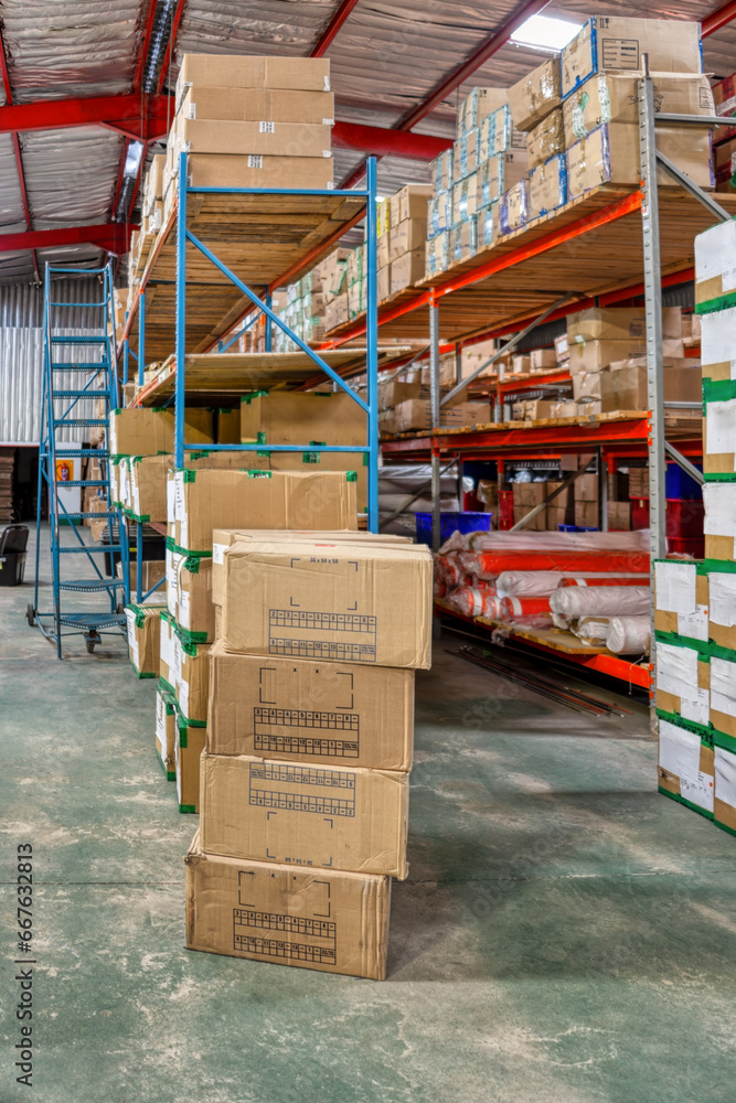 huge warehouse with carton boxes and rolls of textile material in shelfs