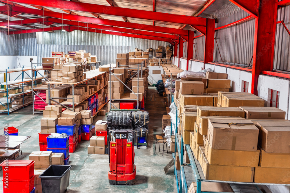 huge warehouse with carton card and plastic crates boxes in shelfs, high point of view