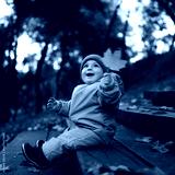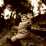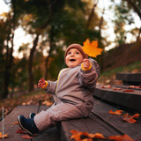 A small beautiful baby in a warm overalls sits on a wooden ladder. A walk on the street among the yellow leaves.