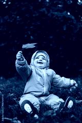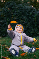 Little beautiful baby sitting on green lawn among yellow autumn leaves. Walking outside in the fresh air in cold weather.