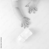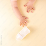 The baby's hands reach for the milk bottle on a yellow background. Concept, top view, copy space.
