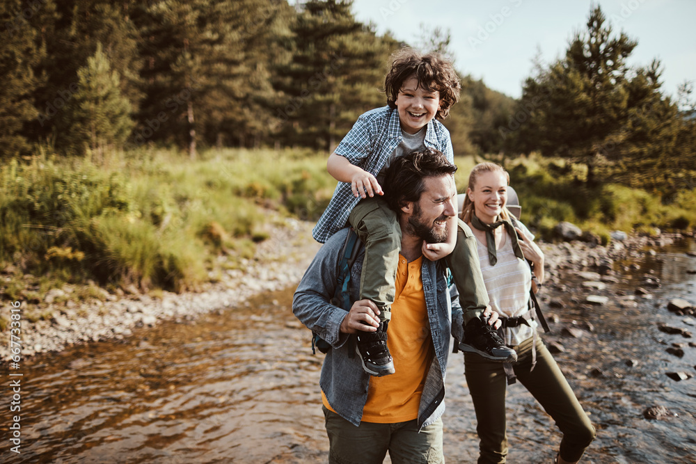 Young family walking across a mountain stream in nature