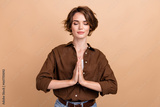 Photo of cheerful dreamy girl dressed brown shirt closed eyes praying arms together isolated beige color background