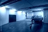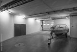 White motorboat on transport cradle in underground garage on parking lot. Sweden.