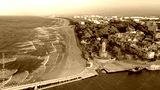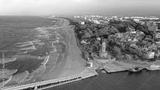 This aerial shot focuses on Kołobrzeg's iconic lighthouse and the thriving harbor beneath it. The coastal charm, combined with the maritime atmosphere of this Polish gem, is beautifully showcased.