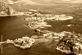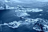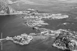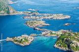 View from the Reinebringen mountain to the skerries of Reine and Hamnoy, connected by bridges and dams, close-up, Lofoten, Norway