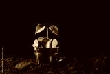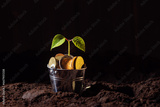 A seedling grows on a pile of coins, gold coins and green seedling on soil, business ideas, economic growth
