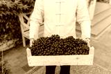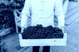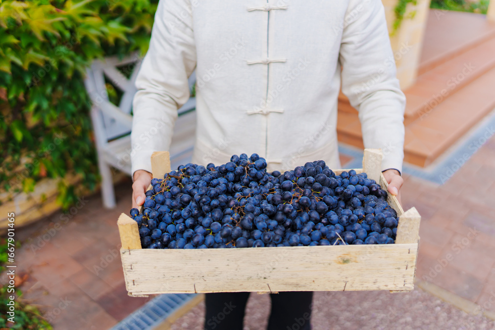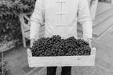 without a face. A man holds a box of ripe blue grapes in his hands.
