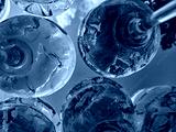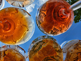Lots of wine cocktail glasses against the background of the blue sky.