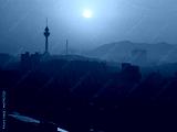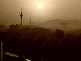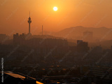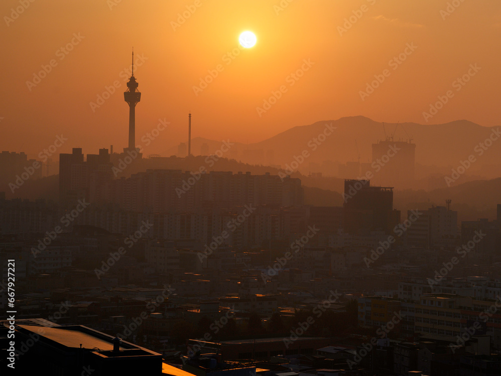 Daegu City Skyline at Sunrise in South Korea over the Apsan Mountains and Daegu 83 Tower in the fog and smog, tranquil cityscape of the old textile industry powerhouse in Asia