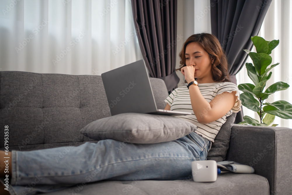 women patients sit on the sofa in an online consultation with the doctor on a laptop talking about illness and medication via video call at home, Telemedicine and health care technology online concept