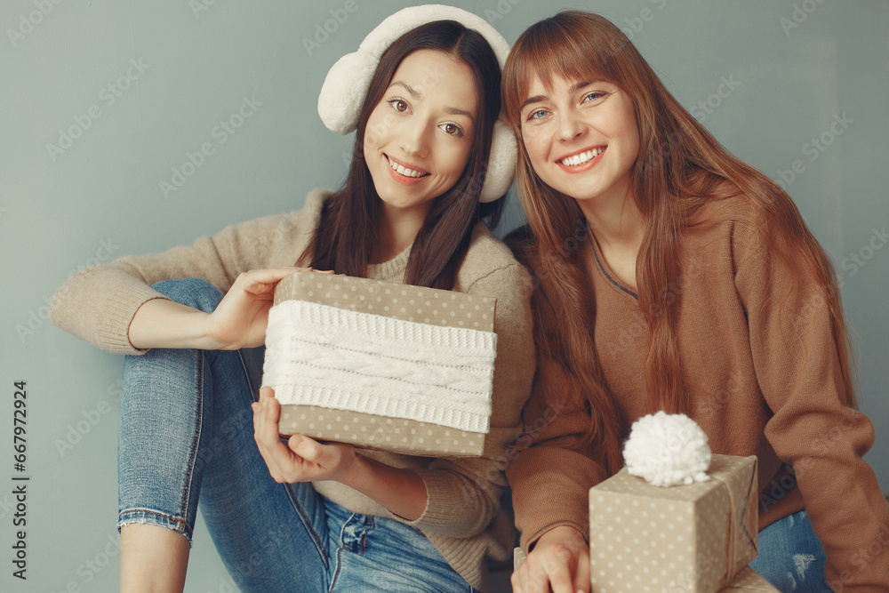 Beautiful girls have fun in a studio with presents