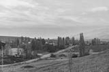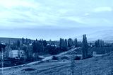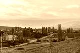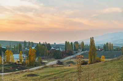 Autumn in the mountains. Rays of the setting sun over the road in a mountain village.