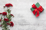 Burgundy chrysanthemums and a green gift box with a red bow on a concrete background.