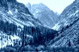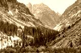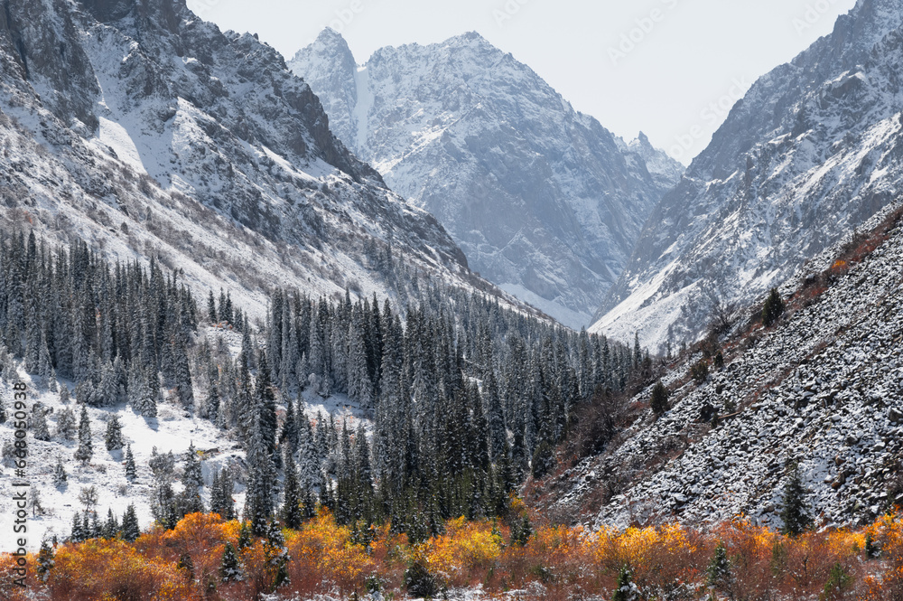 Mountain gorge in autumn. Yellow undergrowth and snow on rocky peaks.