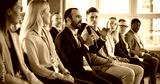 Multiethnic Male Technology Conference Attendee Sittign In Crowd And Using Microphone To Ask A Question Related To Presentation Of An Innovative Gadget. Middle Eastern Man At International Tech Forum.