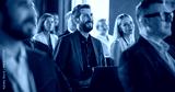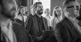 Caucasian Man Sitting in a Crowded Audience at an IT Conference. Delegate Using Laptop Computer to Take Notes. Software Developer Watching Presentation About New High Tech Products and Cloud Solutions