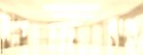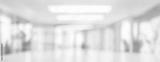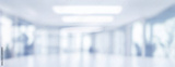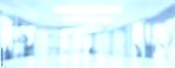 Beautiful light blue blurred background panoramic image of a spacious office or mall hallway.