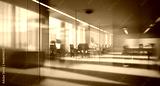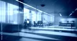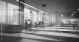 Beautiful blurred background of a modern office interior in gray tones with panoramic windows, glass partitions and orange color accents.