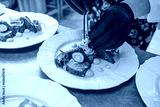 Chef decorated a starter plate with cucumber spaghetti