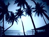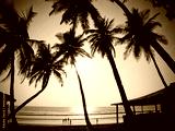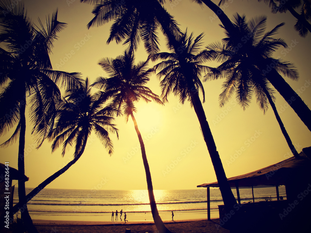Palms silhouettes against sun, vintage retro style, Goa, India.