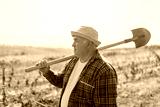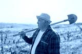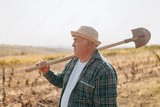 Harvest Time A Seasoned Farmer Carrying a Shovel, Ready to Tend to His Bountiful Fields. Steadfast in Farming Senior Man Walking with Shovel, side view