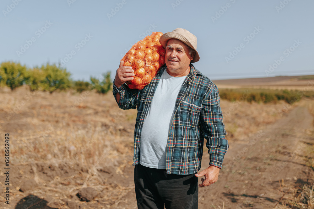 Rural Harvest A Senior Farmer Walks with a Sack of Freshly Harvested Vegetables. Harvest Season in Rural America A Senior Farmer with a Sack of Crops