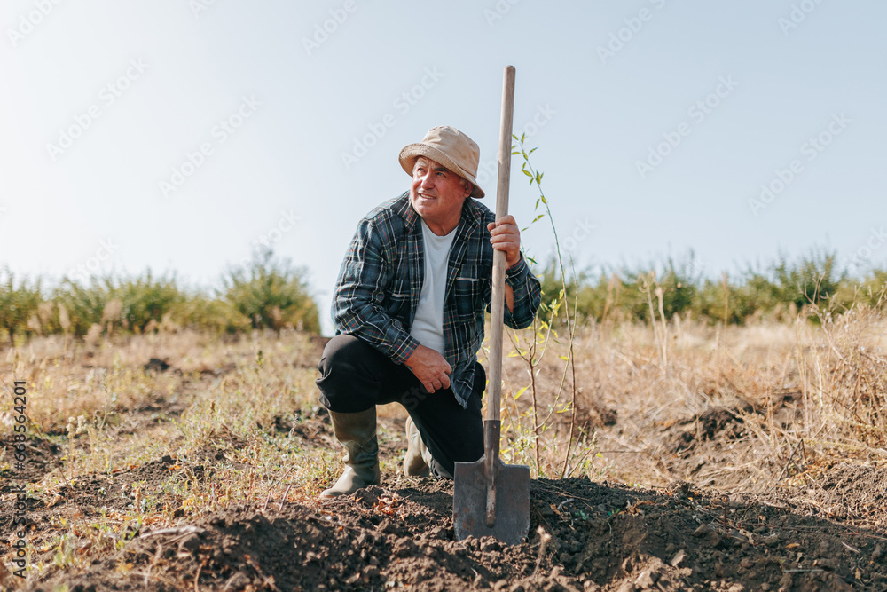 An Elderly Caucasian Farmer Stands Tall in the Heart of His Farmland, Grasping a Shovel as He Tends to His Harvest. The Proud Senior Farmer A Portrait of Rural Wisdom and Hard Work