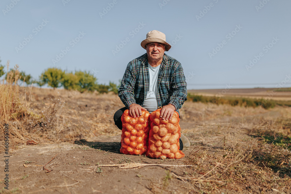 Venture into a rural plantation where a dedicated man tends to his crops, gripping a sack of freshly harvested onions. It's a real person's connection with the land and nature.