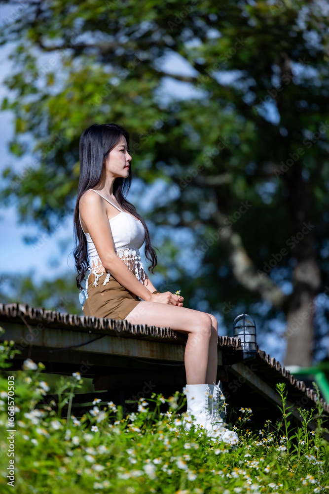 Young Asian woman sitting admiring nature. Woman traveler relaxing admiring landscape view. Beautiful girl enjoying moment, nature, traveling tourism. Woman tourist relaxing in admiring view.