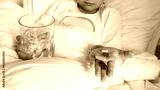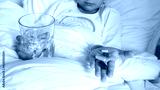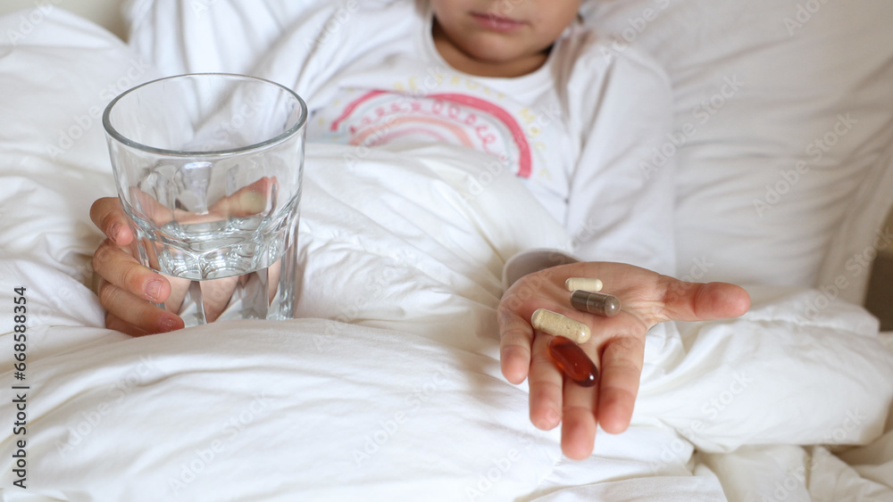Closeup child hands palm hold glass water and medical pills. Sick Kid lying in bed ready taking medicine, vitamin mineral supplements,nutrition,health care, treatment.
