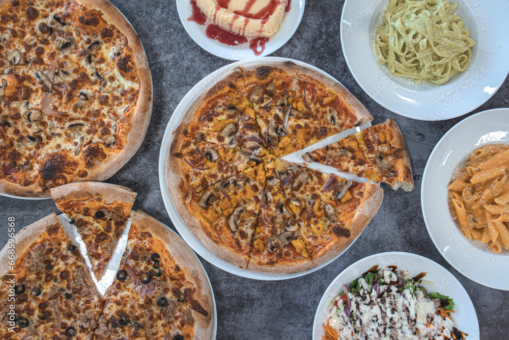Variety of pizzas and pasta dishes on the restaurant table