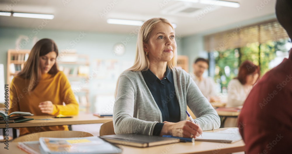 Middle-Aged Female Motivated to Learn New Skills During an Adult Education Course in School. Diverse Mature Students Learning in Classroom, Reading Textbooks and Writing in Notebooks