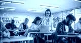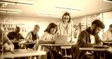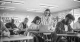 Young Female Teacher Giving a Lecture During an Adult Education Course in School, Having a Conversation with a Older Female with Laptop. Diverse Mature Students Doing Textbook Exercises in Classroom