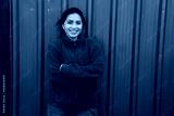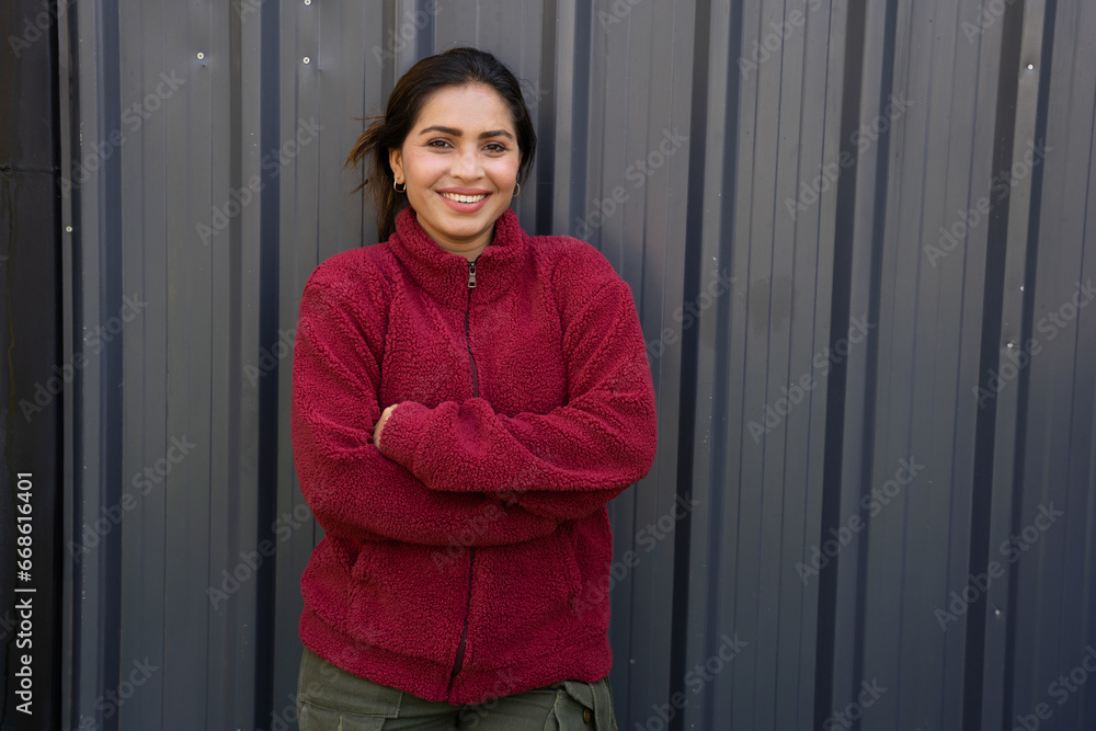 Smiling Young indian woman wearing red warm winter jacket, Standing isolated over black background