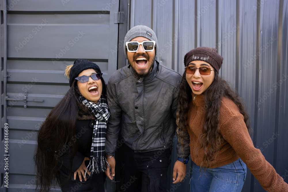 Happy young indian friends wearing winter clothes shouting having fun isolated on grey background. Friendship, Enjoyment.