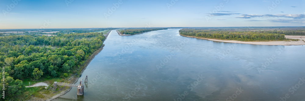 aerial panorama of Mississippi River and entrance to the Chain of Rocks Bypass Canal above St Louis