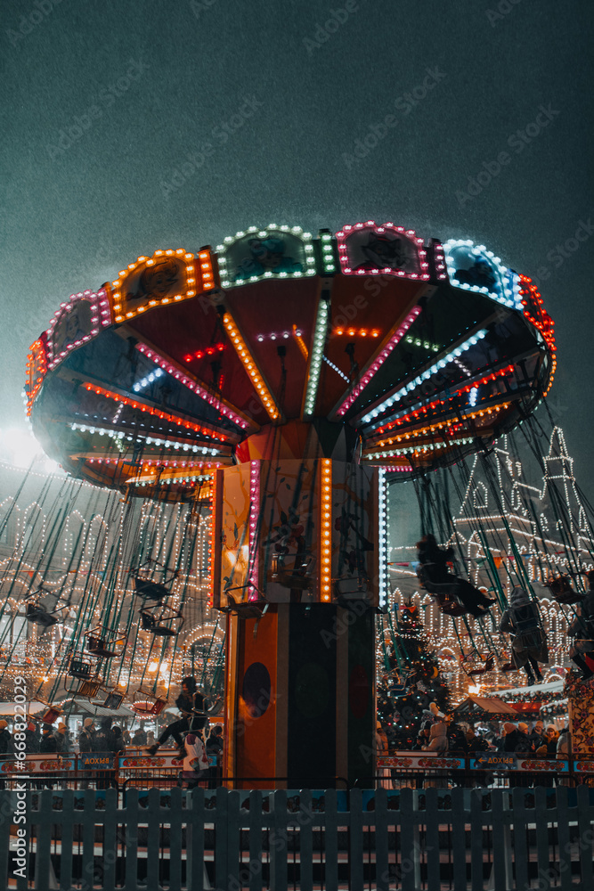 Winter season in the night. Glowing festive carousel whirling on the street under the flying snow.